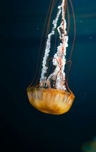 A large, graceful jellyfish native to the Pacific coast of North America. It features a golden-brown bell with dark radial stripes and extremely long, flowing tentacles that can reach several meters. This species drifts slowly through coastal waters, feeding on plankton and small fish, and is admired for its striking appearance, though it can deliver a mild to moderate sting.